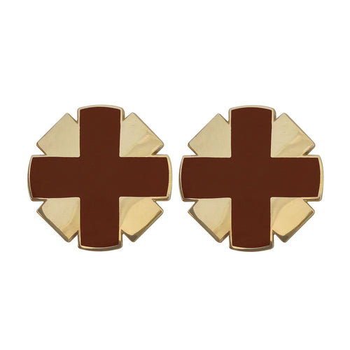 Criteria: This product is the unit crest for the 44th Medical Brigade. The colors maroon and white allude to the Medical Corps. The main design is of two crosses superimposed upon one another, symbolizing the unit's primary medical and surgical missions. The four points of each cross represent the unit's numerical designation. Also called distinctive unit insignia, this item is meant for wear on the Army Dress Blue (ASU) Uniform.