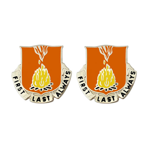 Criteria: This product is the unit crest for the 53rd Signal Battalion. The unit's motto, "First, Last, Always," is emblazoned along the lower edge of the design. The colors orange and white allude to the unit's Signal designation. The bonfire and smoke refer to the practice of smoke signaling, an early form of signal communication. Also known as distinctive unit insignia, this item is made expressly for wear on the Army Dress Blue (ASU) Uniform.