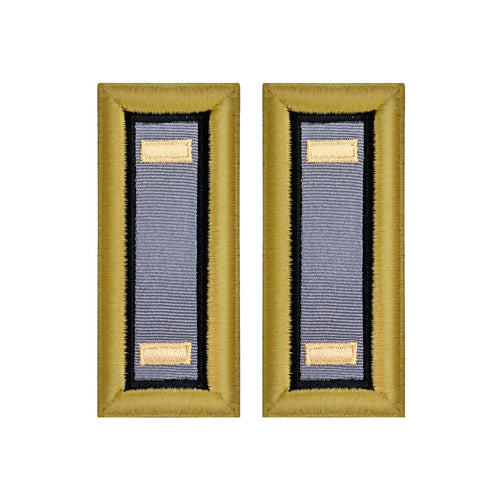 Criteria: Army Shoulder Boards are designed for wear on the Army Dress Blue uniform. For general officers, the background is blue-black velvet. For all other officers, the background is a rayon-grosgrain ribbon of the first-named color of the officer's basic branch. The board has an 11/32-inch gold-colored border, surrounded on the inside and outside by a single strand in gold jaceron. If the officer's branch has two colors, the second branch color is used as a 1/8-inch inside border, in lieu of gold jaceron. Insignia and borders are rayon embroidery or bullion and jaceron.