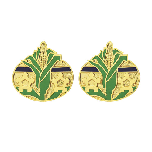 Criteria: This item is the unit crest of the Nebraska National Guard. The main design consists of a ripe ear of corn. Corn is a primary crop of Nebraska and alludes to the state nickname "The Cornhusker State. The two forts and the ellipse represent the capital city of Lincoln as well as the state itself and the prominent role Nebraska had in settling the west. Also called distinctive unit insignia, this item is worn on the Army Dress Blue (ASU) Uniform.