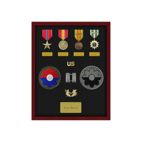 Proudly display your military career or that of a loved one with this expertly-crafted Small Shadow Box. The Pre-Assembled shadow boxes are professionally constructed by our team of design experts. Each one is carefully built according to award precedence, while maintaining proportion, balance and symmetry. Every award mounted in the shadow box will include an identification plate engraved in-house on high-quality brass.