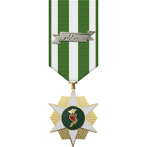 The Republic of Vietnam Campaign Medal (VCM, VNCM) was a decoration presented by South Vietnam to recognize members of allied forces who served in the Vietnam War for a period of at least six months. Service members who were wounded, captured or killed in action were automatically awarded the medal regardless of time served. The "1960 Bar" device is given with the medal and was meant to indicate the years the war was fought from beginning to finish. Since the Republic of Vietnam was conquered by North Vietnam in 1975, the government no longer existed and no end date was ever made for the bar.