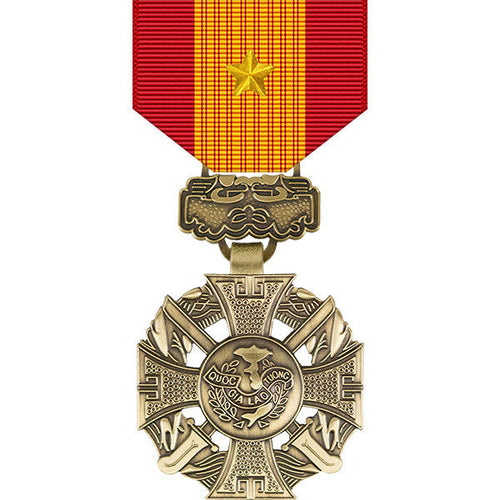 The Republic of Vietnam Gallantry Cross Medal was a decoration presented by South Vietnam to recognize valor and gallantry while serving in active combat against enemy forces. The medal was issued in four degrees represented by the type of device worn on the medal. The Gallantry Cross with Palm indicates an individual award cited before the Army, the Gallantry Cross with Gold Star indicates a Corps citation, the Gallantry Cross with Silver Star indicates a Division citation and the Gallantry Cross with Bronze Star indicates a Regiment or Brigade citation. When a higher ranking device is awarded, this device replaces the previous device of lower rank. Devices are not authorized to be worn together.
