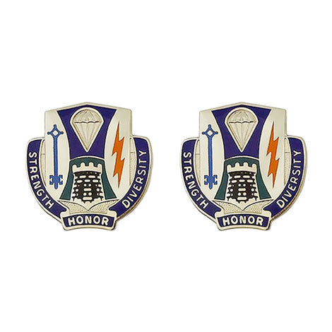 Criteria: These distinctive unit insignia (DUI) are worn by the Special Troops Battalion, 1st Brigade Combat Team, 82nd Airborne Division (STB, 1st BCT, 82nd Airborne). Strength, Honor, Diversity is their motto and is inscribed on each crest. Approved for wear in 2007. Unit crests are worn on the Army Service Uniform (ASU) and Army Class A Uniform (Greens).