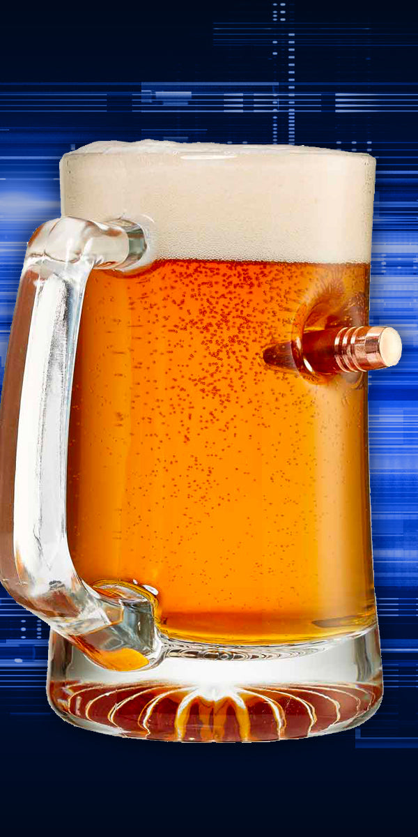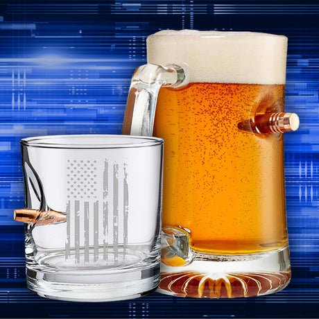 The BenShot MugShot 24oz Beer Mug is built to turn heads. Each mug is hand-embedded with a genuine, lead-free, solid copper .50 caliber machine gun bullet.