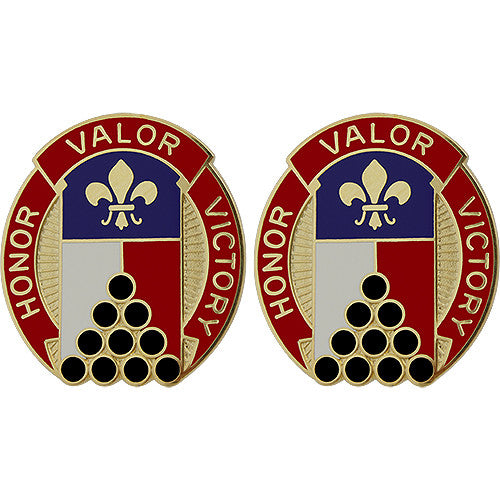 Criteria: These unit crests, also known as Distinctive Unit Insignia (DUI) are currently worn by the 113th Field Artillery Brigade based out of North Carolina. Valor Honor Victory is their motto and is reflected on each crest. Approved for wear in 1974, the insignia was redesignated for the 113th Sustainment Brigade only from 2008-2010. Worn on the Army Service Green and Army Dress Blue Service Uniform (ASU).