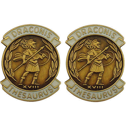 Criteria: These distinctive unit insignia (DUI) are worn by the 18th Finance Group. Assigned to the XVIII Airborne Corps, this unit provides support for finance and accounting operations. Their motto Draconis Thesaurus means Dragons Treasure. Worn on the Army Class A Uniform (Greens) and Army Service Uniform (ASU).