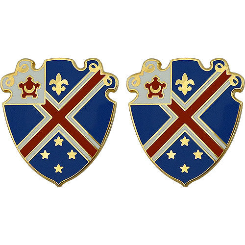 Criteria: This product is the unit crest of the 29th Engineer Battalion. The blue shield with red "X" is adapted from the coat-of-arms of Langres, France where this unit was headquartered during World War I. The four stars commemorate the unit's four major operations during that conflict. The five pointed fort with the crescent represents the unit's service during the Philippine Insurrection. This item is made for wear on the Army Dress Blue (ASU) Uniform.