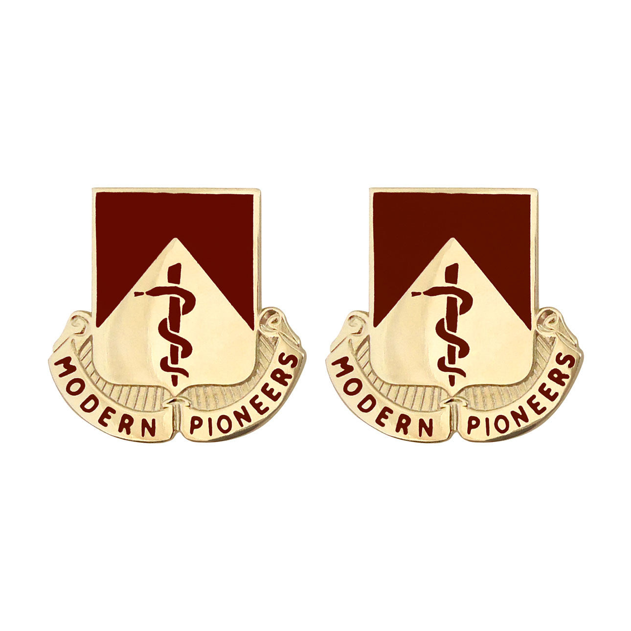 Criteria: This product is the unit crest for the 47th support Battalion. The unit's motto, "Modern Pioneers," is emblazoned across the bottom scroll. The deep red color borders on maroon and this refers to the predecessor unit's Medical designation. The main design element is the Rod of Aesculapius which is an international symbol of medical assistance. Also called distinctive unit insignia, this item is designed for wear on the Army Dress Blue (ASU) Uniform.