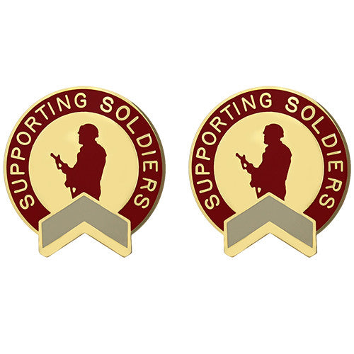 Criteria: This item is the unit crest of the 652nd Support Group. The unit's motto, "Supporting Soldiers," is emblazoned along the outer edge of the design and neatly summarizes the unit's primary mission. The colors scarlet and gold allude to the unit's Support designation. The chevron is a traditional heraldic symbol of support and the soldier represents front line personnel. Also called distinctive unit insignia, this item is made for wear on the Army Dress Blue (ASU) Uniform.