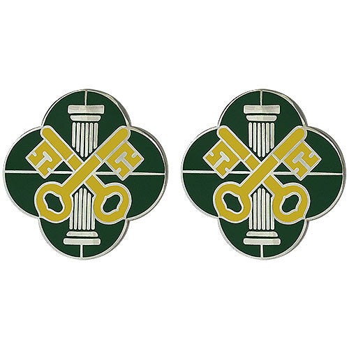 Criteria: This item is the unit crest for the 93rd Military Police Battalion. The colors green and gold allude to the unit's Military Police designation. The four segments of the design commemorate the battle honors award to the unit for service in the Korean War. The column is a traditional heraldic symbol of strength and support while the crossed keys denote readiness and security. Also called distinctive unit insignia, this item is made for wear on the Army Dress Blue (ASU) Uniform.
