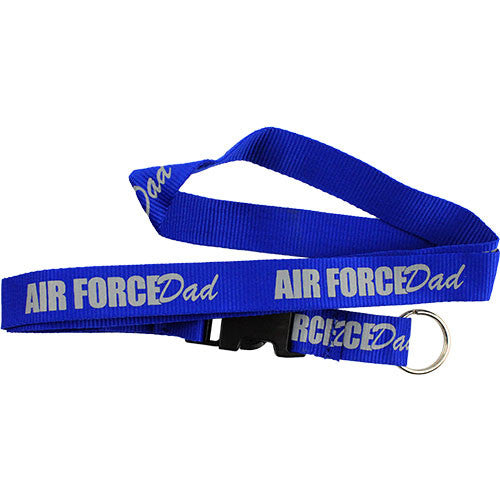 The Air Force Dad Lanyard has "Air Force Dad" silk screened onto it with a split ring and a easy to use side release buckle. The lanyard is blue with white lettering.