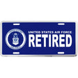 Criteria: The Air Force Retired License Plate is blue, made with quality metal and has the air force seal and the words "U.S. Air Force Retired" stamped on it. The license plate is great for decorations or automobiles.
