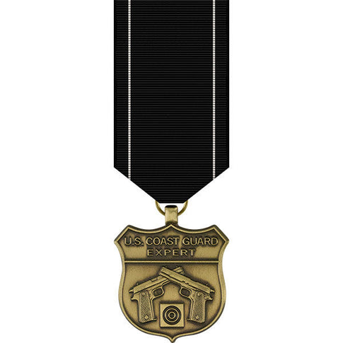 The Coast Guard Expert Pistol Shot Medal is the highest award that a Coast Guardsmen can receive for a pistol qualification. The current qualifying pistols are the M9 or the P229R DAK. The medal is only worn if the recipient has achieved "expert" status with a qualified weapon. If they have achieved the expert status, the service ribbon is worn with a silver E device. A blank ribbon is worn if they have received the Marksman qualification and a bronze S device if they have the Sharpshooter qualification. First issued in 1969, normal qualification tests include shooting one-handed while kneeling and two-handed while standing.