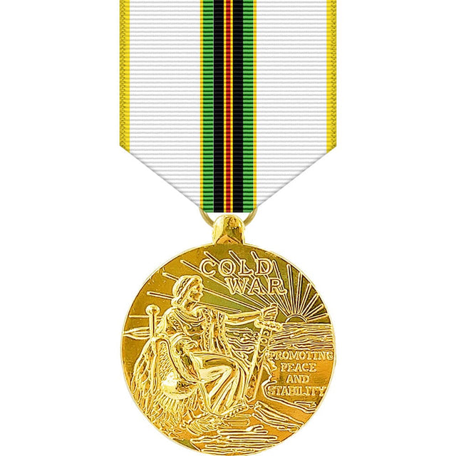 Inspired by the Cold War Recognition Certificate created by Section 1084 of Public Law 105-85, approved on November 18, 1987. The official certificate is to recognize "members of the Armed Forces and civilian personnel of the Government who served the United States during the Cold War." While congress did not specifically authorize a medal for Federal service during the Cold War, this medal has been adopted as the de-facto official Cold War Medal, mainly by its use by State National Guards, along with military and patriotic societies, including being recognized as the official medal of the Military Order of Foreign Wars.