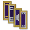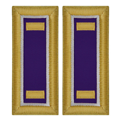 Criteria: Army Shoulder Boards are designed for wear on the Army Dress Blue uniform. For general officers, the background is blue-black velvet. For all other officers, the background is a rayon-grosgrain ribbon of the first-named color of the officer's basic branch. The board has an 11/32-inch gold-colored border, surrounded on the inside and outside by a single strand in gold jaceron. If the officer's branch has two colors, the second branch color is used as a 1/8-inch inside border, in lieu of gold jaceron. Insignia and borders are rayon embroidery or bullion and jaceron.