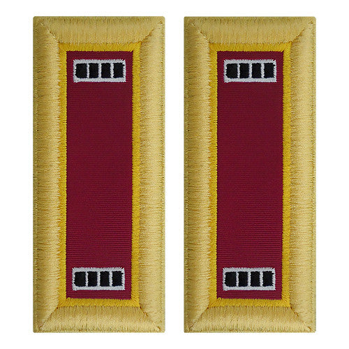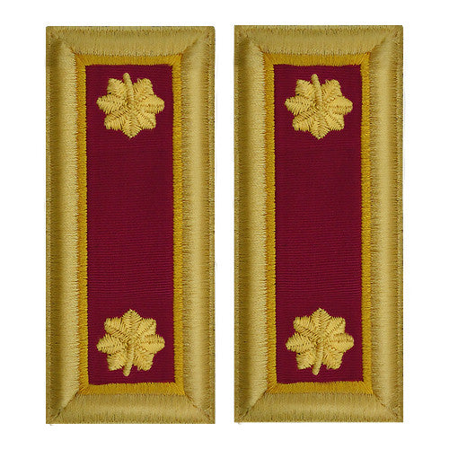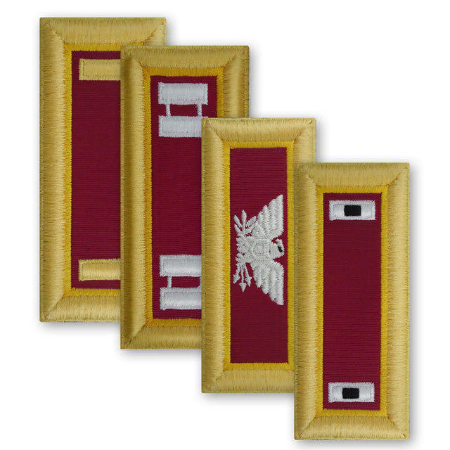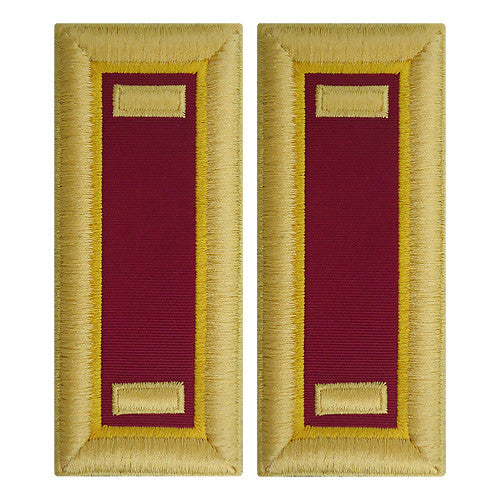 Criteria: Army Shoulder Boards are designed for wear on the Army Dress Blue uniform. For general officers, the background is blue-black velvet. For all other officers, the background is a rayon-grosgrain ribbon of the first-named color of the officer's basic branch. The board has an 11/32-inch gold-colored border, surrounded on the inside and outside by a single strand in gold jaceron. If the officer's branch has two colors, the second branch color is used as a 1/8-inch inside border, in lieu of gold jaceron. Insignia and borders are rayon embroidery or bullion and jaceron.