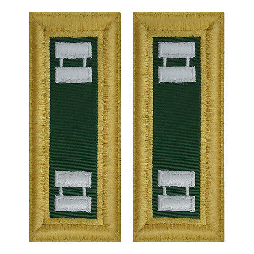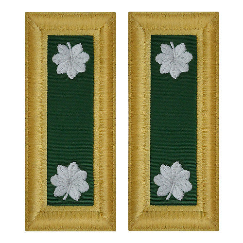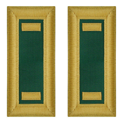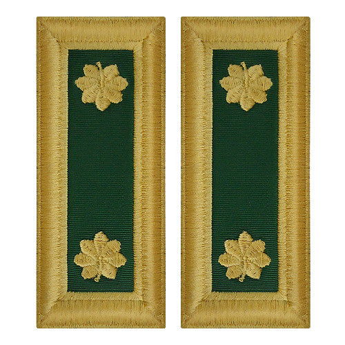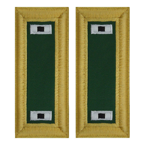 Criteria: Army Shoulder Boards are designed for wear on the Army Dress Blue uniform. For general officers, the background is blue-black velvet. For all other officers, the background is a rayon-grosgrain ribbon of the first-named color of the officer's basic branch. The board has an 11/32-inch gold-colored border, surrounded on the inside and outside by a single strand in gold jaceron. If the officer's branch has two colors, the second branch color is used as a 1/8-inch inside border, in lieu of gold jaceron. Insignia and borders are rayon embroidery or bullion and jaceron.