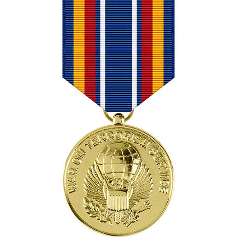 The Global War on Terrorism Service Medal (GWOTS) is a decoration of the United States Armed Forces presented to members of the U.S. military who have served in the War on Terror from September 11, 2001 to a yet to be determined date. To be eligible, service members must have served at least 30 consecutive or 60 cumulative days within an authorized anti-terrorism campaign. Service time may be waived when a service member participated in active combat, required medical evacuation after having been wounded or posthumously for any service member who dies from combat or non-combat wounds while in the line of duty. The designated operations for the GWOTS are as follows: Airport Security Operation, Operation Enduring Freedom, Operation Noble Eagle and Operation Iraqi Freedom. The Global War on Terrorism Expeditionary Medal is a similar award, with the primary difference being that it is awarded for service on foreign shores, while the GWOTS is generally awarded for service within the United States.