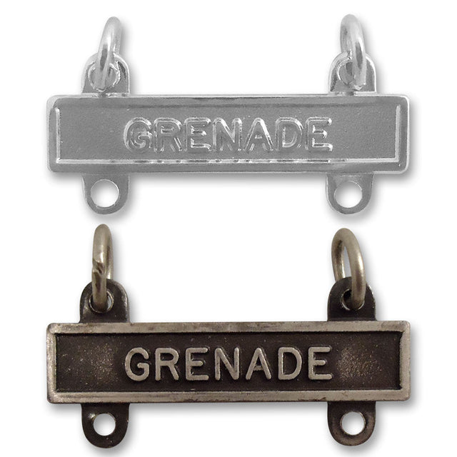 Criteria: The Grenade Bar is presented upon completion of the weapons qualification course along with one of the three Army Weapons Qualifications Badges. Weapons Qualification Badges are issued in three levels (in ascending order): Marksman, Sharpshooter, and Expert. Weapons qualification badges are displayed in various weapons classes by bars which are hung below the badge itself.