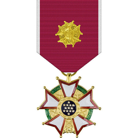 The Legion of Merit Medal (LM, LOM) is a decoration presented by the United States Armed Forces to members of the United States Military, as well as foreign military members and political figures, who have displayed exceptionally meritorious conduct in the performance of outstanding services and achievements. The performance must be of significant importance and far exceed what is expected by normal standards. When the award is presented to foreign parties, it is divided into separate ranking degrees. The degrees are as follows: Chief Commander - issued to a head of state or government; Commander - issued to a chief of staff or higher position that is not head of state; Officer - issued to a general or flag officer that is below the chief of staff, colonel or equivalent rank; Legionnaire - issued to all other service members ranking lower than those previously mentioned. Awards presented to United State military members are not divided into degrees. Subsequent awards are denoted by Oak Leaf Clusters for U.S. Army and Air Force members and Award Stars for U.S. Navy, Marine Corps and Coast Guard members. The Valor device is also authorized to be worn by the U.S. Navy, Marine Corps and Coast Guard, but not by the U.S. Army or Air Force.