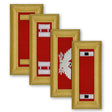 Criteria: Army Shoulder Boards are designed for wear on the Army Dress Blue uniform. For general officers, the background is blue-black velvet. For all other officers, the background is a rayon-grosgrain ribbon of the first-named color of the officer's basic branch. The board has an 11/32-inch gold-colored border, surrounded on the inside and outside by a single strand in gold jaceron. If the officer's branch has two colors, the second branch color is used as a 1â8-inch inside border, in lieu of gold jaceron. Insignia and borders are rayon embroidery or bullion and jaceron.