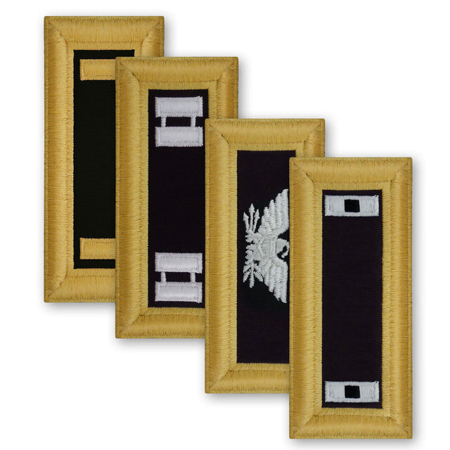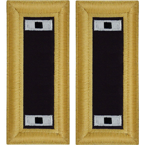 Criteria: Army Shoulder Boards are designed for wear on the Army Dress Blue uniform. For general officers, the background is blue-black velvet. For all other officers, the background is a rayon-grosgrain ribbon of the first-named color of the officer's basic branch. The board has an 11/32-inch gold-colored border, surrounded on the inside and outside by a single strand in gold jaceron. If the officer's branch has two colors, the second branch color is used as a 1/8-inch inside border, in lieu of gold jaceron. Insignia and borders are rayon embroidery or bullion and jaceron.