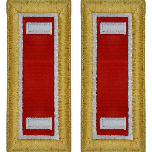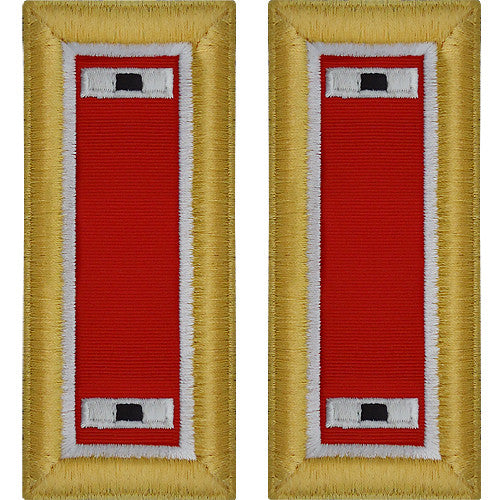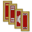 Criteria: Army Shoulder Boards are designed for wear on the Army Dress Blue uniform. For general officers, the background is blue-black velvet. For all other officers, the background is a rayon-grosgrain ribbon of the first-named color of the officer's basic branch. The board has an 11/32-inch gold-colored border, surrounded on the inside and outside by a single strand in gold jaceron. If the officer's branch has two colors, the second branch color is used as a 1/8-inch inside border, in lieu of gold jaceron. Insignia and borders are rayon embroidery or bullion and jaceron.
