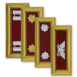 Criteria: Army Shoulder Boards are designed for wear on the Army Dress Blue uniform. For general officers, the background is blue-black velvet. For all other officers, the background is a rayon-grosgrain ribbon of the first-named color of the officer's basic branch. The board has an 11/32-inch gold-colored border, surrounded on the inside and outside by a single strand in gold jaceron. If the officer's branch has two colors, the second branch color is used as a 1/8-inch inside border, in lieu of gold jaceron. Insignia and borders are rayon embroidery or bullion and jaceron.