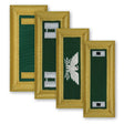 Criteria: Army Shoulder Boards are designed for wear on the Army Dress Blue uniform. For general officers, the background is blue-black velvet. For all other officers, the background is a rayon-grosgrain ribbon of the first-named color of the officer's basic branch. The board has an 11/32-inch gold-colored border, surrounded on the inside and outside by a single strand in gold jaceron. If the officer's branch has two colors, the second branch color is used as a 1/8-inch inside border, in lieu of gold jaceron. Insignia and borders are rayon embroidery or bullion and jaceron.