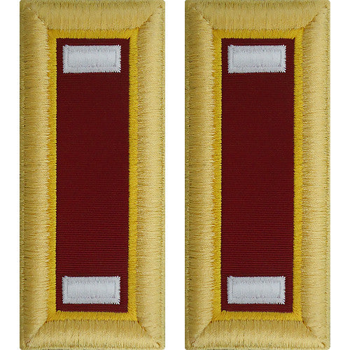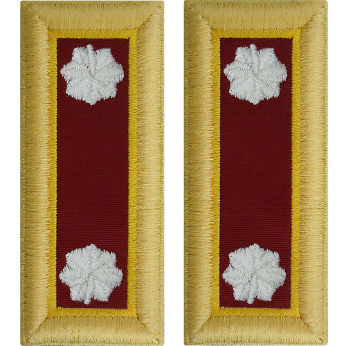 Criteria: Army Shoulder Boards are designed for wear on the Army Dress Blue uniform. For general officers, the background is blue-black velvet. For all other officers, the background is a rayon-grosgrain ribbon of the first-named color of the officer's basic branch. The board has an 11/32-inch gold-colored border, surrounded on the inside and outside by a single strand in gold jaceron. If the officer's branch has two colors, the second branch color is used as a 1/8-inch inside border, in lieu of gold jaceron. Insignia and borders are rayon embroidery or bullion and jaceron.