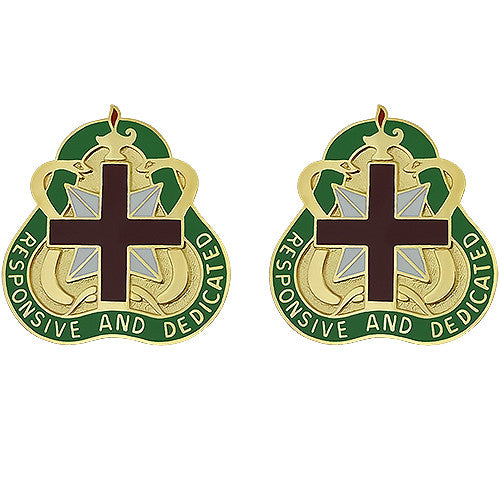 Criteria: This product is the unit crest of the Army Medical Command. The unit's motto, "Responsive and Dedicated," is emblazoned along the lower edge of the design. The colors maroon and white are the colors of the Medical branch. The cross is a traditional symbol of medical assistance. Also known as distinctive unit insignia, this item is designed specifically for wear on the Army Dress Blue (ASU) Uniform.