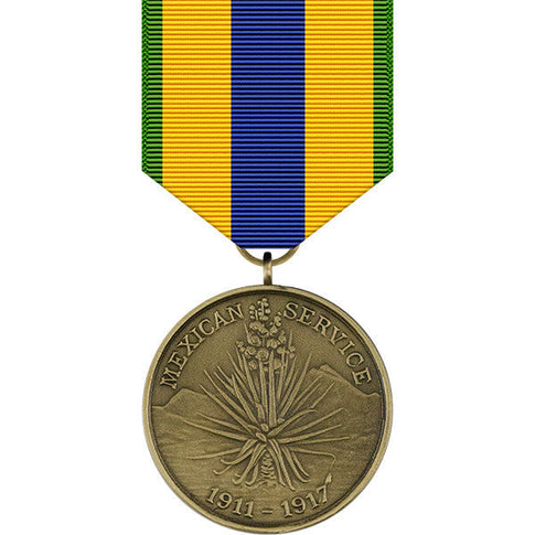 The Mexican Service Medal is a decoration presented by the United States military to recognize service members who participated in specific expeditions against Mexico from April 12, 1911 - June 16, 1919. The U.S. Army and the U.S. Navy/Marine Corps have different versions of the medal, with the Army version showing a yucca plant and the Navy/Marine Corps version showing a fortress with water. There are no devices authorized for the Navy/Marine Corps version; however, a citation star for heroism in battle is authorized for the Army version.
