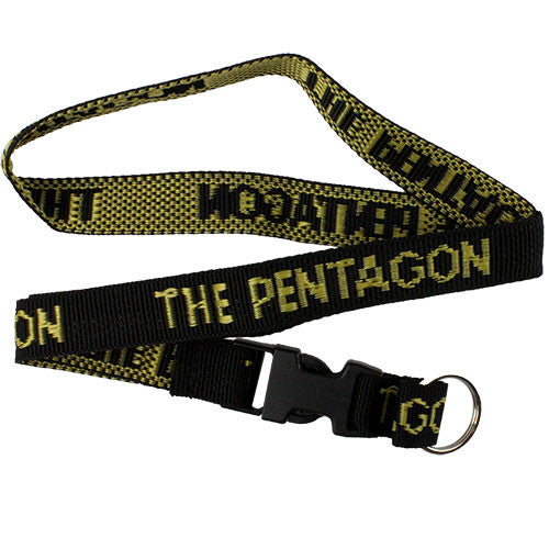 Criteria: The Pentagon Lanyard has "The Pentagon" silk screened onto it with a split ring and a easy to use side release buckle. The lanyard is black with yellow lettering.