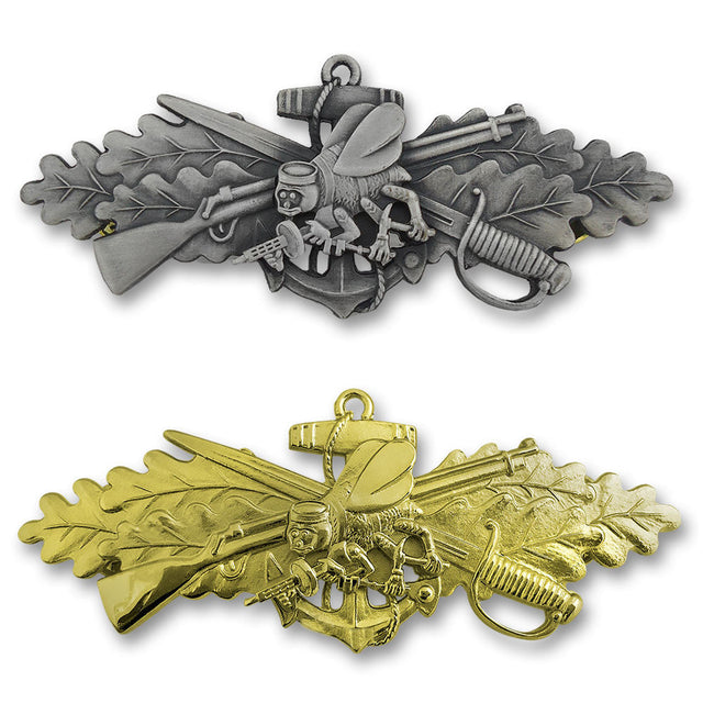 To be awarded the insignia, a service member must have completed the prescribed Naval Construction Force Personnel Qualification Standards (PQS), which entails required coursework, qualification tasks standards, written examination, and a field exercise. Upon final completion of all prescribed training, a "murder" board, which usually last eight hours, is taken. Upon completion of the "murder board," a final board (usually two-fours) is given. Once the member has completed all of the above requirements, they are designated a Seabee Combat Warfare Specialist. The Seabee Combat Warfare insignia is primarily presented to members of the Civil Engineer Corps (CEC) or the Construction Battalions (CB); however, the insignia is not limited only to this branch of the Navy. Any sailor of any rate or any officer can qualify, given they are assigned to a qualifying unit (NMCB, UCT, CBMU, ACB, or as of late 2008, NCR) and have completed the prescribed course of instruction.The insignia is issued in two degrees: silver for enlisted personnel and gold for officers. The insignia features an armed Seabee, superimposed over a crossed sword and rifle (a Springfield M1903) atop oak leaves. The Bee is also the insignia for the Navy Seabees as a whole.