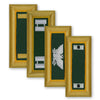 Criteria: Army Shoulder Boards are designed for wear on the Army Dress Blue uniform. For general officers, the background is blue-black velvet. For all other officers, the background is a rayon-grosgrain ribbon of the first-named color of the officer's basic branch. The board has an 11/32-inch gold-colored border, surrounded on the inside and outside by a single strand in gold jaceron. If the officer's branch has two colors, the second branch color is used as a 1/8-inch inside border, in lieu of gold jaceron. Insignia and borders are rayon embroidery or bullion and jaceron.
